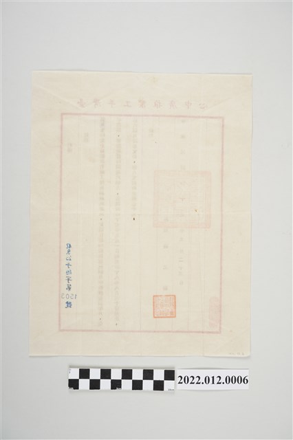 1. 本物件為民國47年9月25日臺灣手工業推廣中心予劉楊玉時(劉靜枝母親)聘函,為直式直寫文書,最上方有「臺灣手工業推廣中心」紅色字樣,文書標題為聘函,標題下方有藍色印章,印章文字為「47.9.25手總字第1503號」,聘函內容為聘用劉楊玉時為關廟竹細工技術訓練班講師,任教時間分為4期,每期1個半月,實際任教時間為6個月,聘用時間自民國47年9月1日起至民國48年8月30日止,每月薪資新臺幣1000元,以6個月支薪,合計共6000元,經理為嚴之衛,聘函日期為民國47年9月25日,有2枚紅色機關大印及1枚經理職稱印章。
