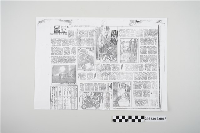 1. 本物件為民國75年10月30日《民眾日報》第9版關廟專訪與從粗糙邁向精緻的「竹編」專欄之報導影本,為雙面黑白印刷。正面為詹龍編撰從粗糙邁向精緻的「竹編」之專題報導,專訪內容為介紹竹編工藝及工藝師劉靜枝;背面為《民眾日報》第9版關廟專訪,報導時間為民國75年10月30日,報導者為柯志齡、劉鳳芸,專訪內容為採訪關廟竹編工藝師歐金葉、楊保明夫婦及劉靜枝之專長與對竹編產業之看法,並著重描述竹編工藝成為夕陽產業之事實。