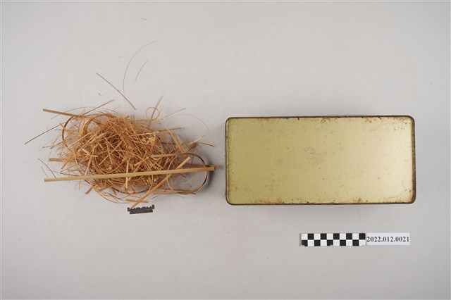 1. 本物件為劉靜枝之竹編材料盒組,以黑色「パパヤ黑砂糖石鹼」金屬盒盛裝,內為粗細不同的竹條,有細長竹片,也有極細的竹絲,這些竹材纏在一起。 2. 劉靜枝為民國31年次出生,關廟人,其竹編技藝傳承自其母親劉楊玉時,劉靜枝曾獲臺灣工藝研究中心邀請參加「中日工藝展」,她最為知名為竹編的小竹籃,由小到大的竹編籃,最小約0.7公分,精湛的技藝深獲好評。