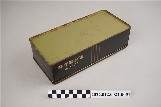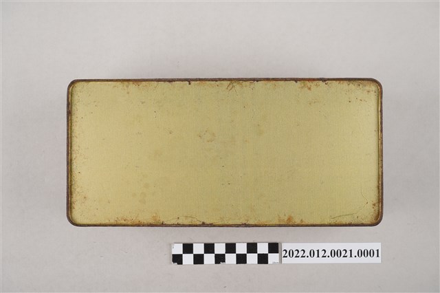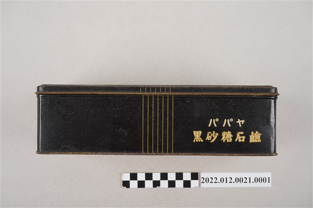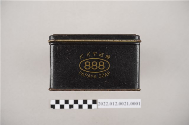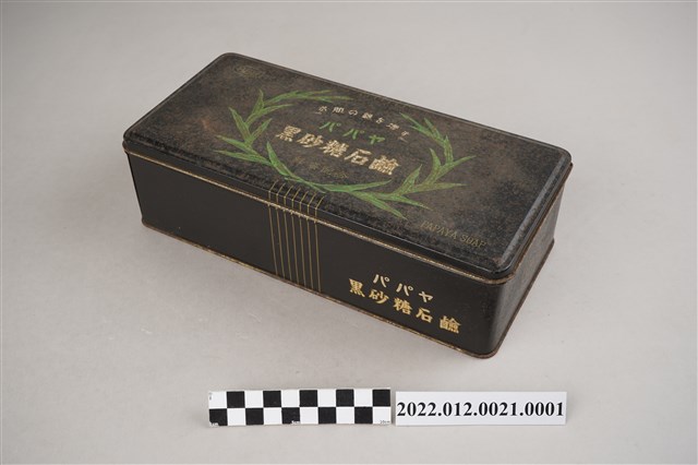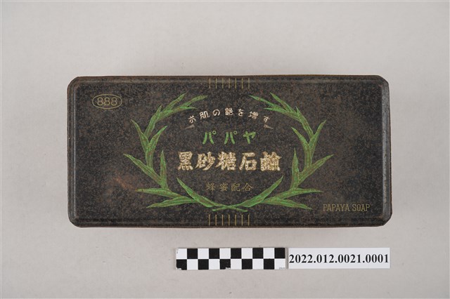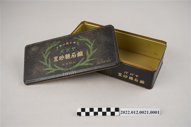 1. 本物件是劉靜枝之黑砂糖肥皂鐵盒,為劉靜枝用來裝竹編材料所用。金屬製,鐵盒外觀有磨損痕跡,金屬蓋上有連續綠葉片圖案,於葉片間寫有「お肌の艷を增す」、「パパヤ」、「黑砂糖石鹼」、「蜂蜜配合」等字樣,左上角有1個墨綠色空心橢圓形,橢圓形中有「888」字樣,右下角有墨綠色「PAPAYA SOAP」字樣,金屬盒側邊也有「パパヤ」、「黑砂糖石鹼」等商標字樣。