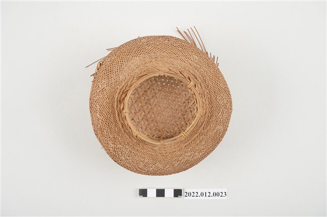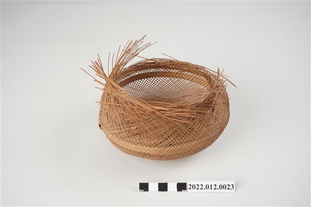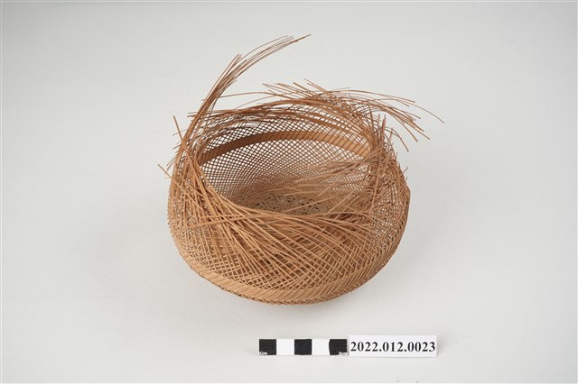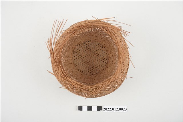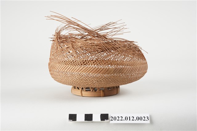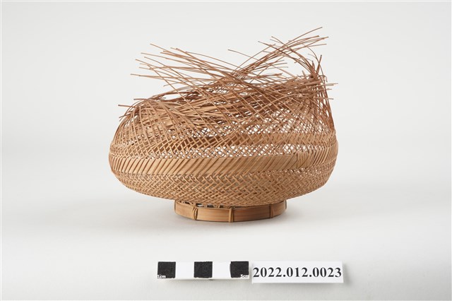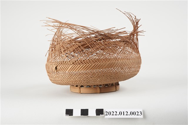 1. 本物件為劉靜枝編製竹籃半成品,籃身以輪口編法起底編織,緣口未收邊,並於籃身中間以較厚的竹片加固,底部為風車花式編(雙重三角編),再以厚竹片墊高底部。 2. 本件創作者劉靜枝為民國31年次出生,關廟人,其竹編技藝傳承自其母親劉楊玉時,劉靜枝曾獲臺灣工藝研究中心邀請參加「中日工藝展」,她最為知名為竹編的小竹籃,由小到大的竹編籃,最小約0.7公分,精湛的技藝深獲好評。