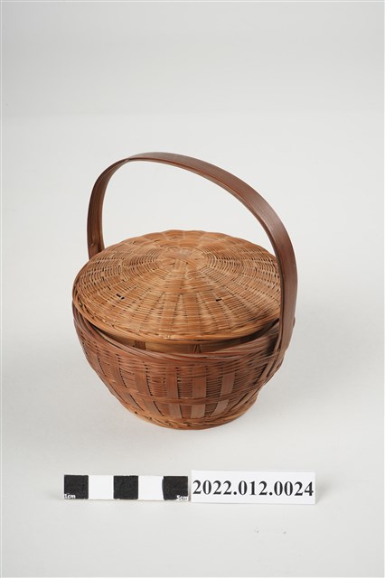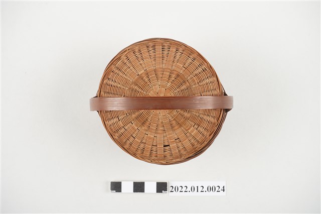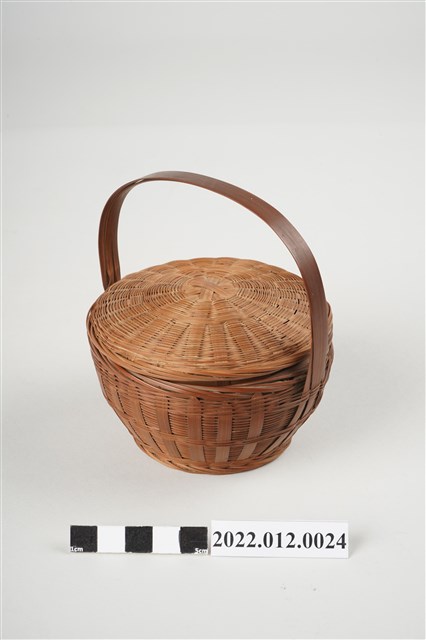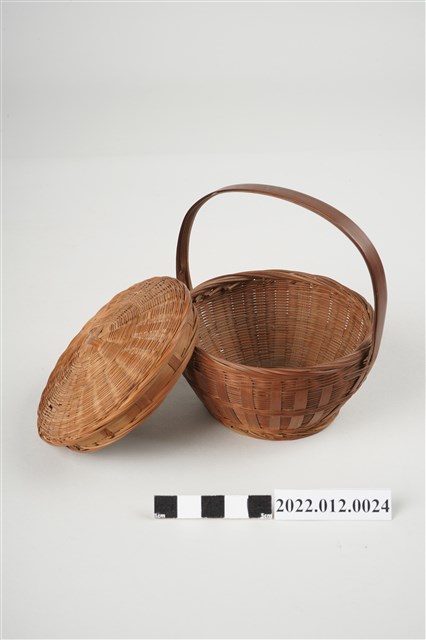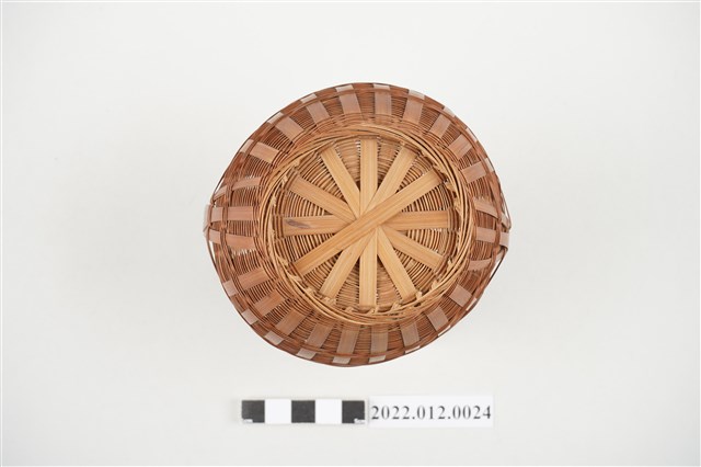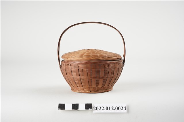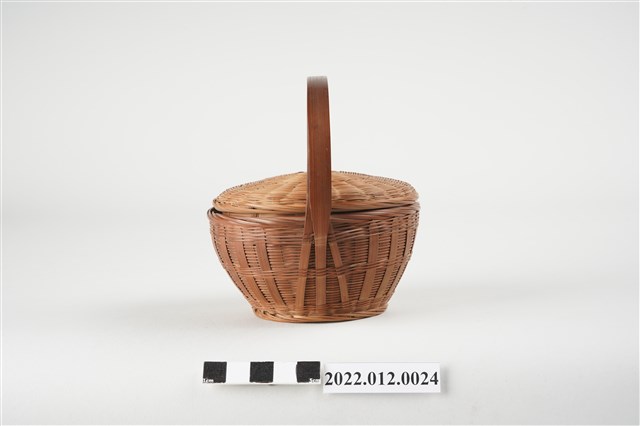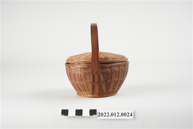 1. 本物件為劉靜枝編製竹籃,可分為竹籃及竹籃蓋2個部份,竹籃蓋以米字編技法編製,竹籃身亦由米字編編製而成,竹籃蓋可掀開,有厚竹片製成的提把。此竹籃比一般竹籃尺寸小,為劉靜枝所擅長的微型竹工藝製品。