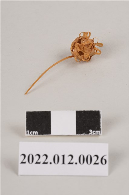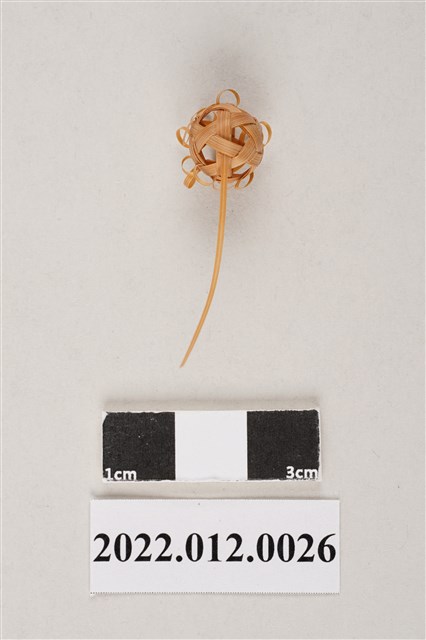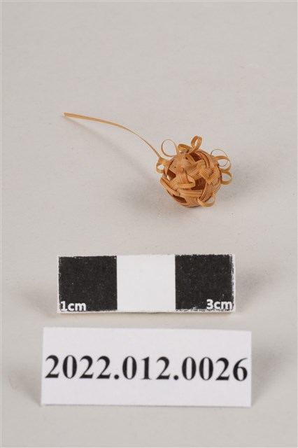 1. 本物件為劉靜枝編製球型竹編半成品,主體以三角孔編法製成球體狀,再以裝飾編織技法於圓球上形成立體裝飾,立體裝飾集中環繞圓球一圈,作品未收邊完成。 2. 劉靜枝為民國31年次出生,關廟人,其竹編技藝傳承自其母親劉楊玉時,劉靜枝曾獲臺灣工藝研究中心邀請參加「中日工藝展」,她最為知名為竹編的小竹籃,由小到大的竹編籃,最小約0.7公分,精湛的技藝深獲好評。