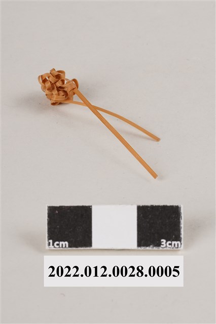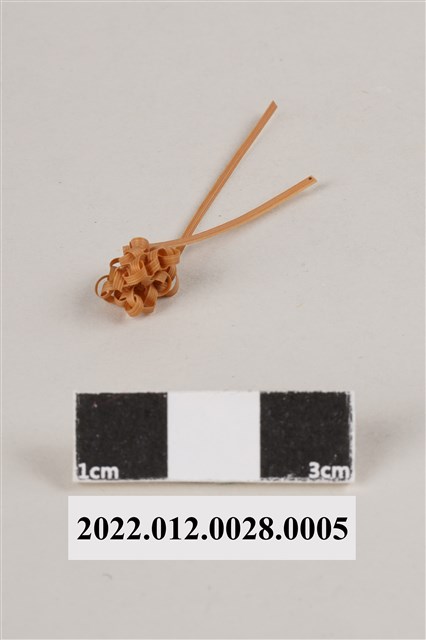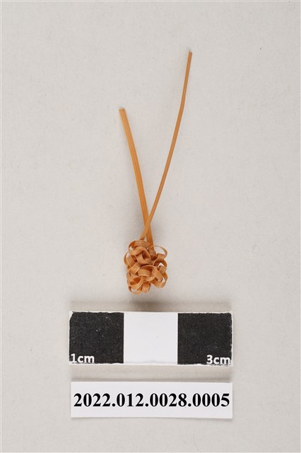 1. 本物件為劉靜枝編製繩狀竹編半成品,共有6枚半成品組成,4枚為條狀、2枚為球狀,主體皆為以2至3條細竹篾編織而成的立體繩條,作品尚未完成。 2. 劉靜枝為民國31年次出生,關廟人,其竹編技藝傳承自其母親劉楊玉時,劉靜枝曾獲臺灣工藝研究中心邀請參加「中日工藝展」,她最為知名為竹編的小竹籃,由小到大的竹編籃,最小約0.7公分,精湛的技藝深獲好評。