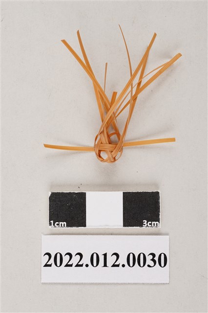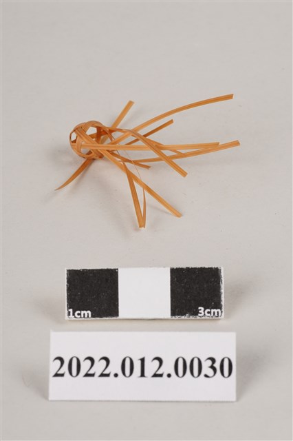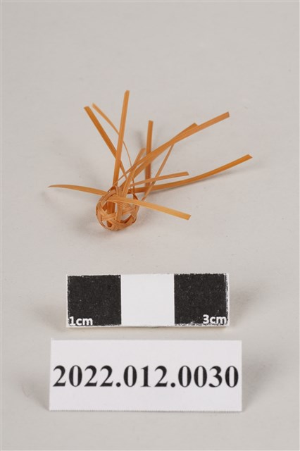 1. 本物件為劉靜枝所製作之圓球半成品,由數條竹篾構成,已有接近球型之形狀產生,長條竹篾未收邊,凸出於球型外,此作品尚未完成。 2. 劉靜枝為民國31年次出生,關廟人,其竹編技藝傳承自其母親劉楊玉時,劉靜枝曾獲臺灣工藝研究中心邀請參加「中日工藝展」,她最為知名為竹編的小竹籃,由小到大的竹編籃,最小約0.7公分,精湛的技藝深獲好評。