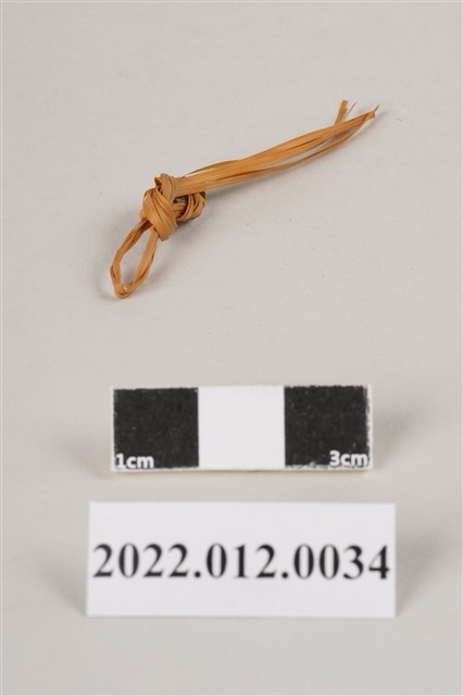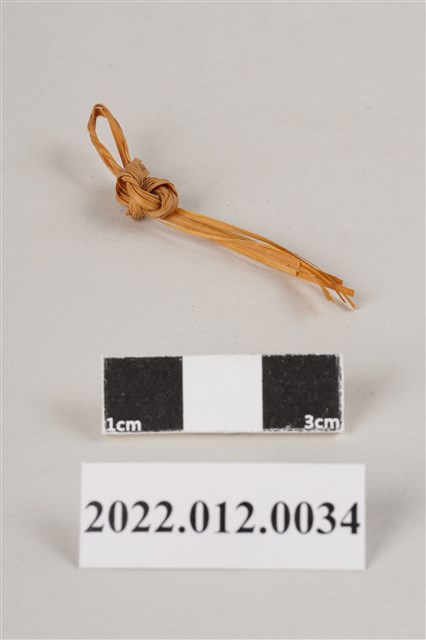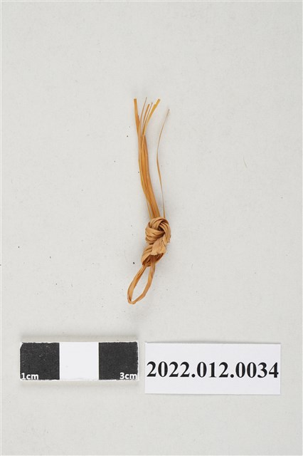 1. 本物件為劉靜枝所製作之竹篾編織結,由數條竹篾集結於一起後繫成1個繩結,編織結的結區塊較繩結區塊大。 2. 劉靜枝為民國31年次出生,關廟人,其竹編技藝傳承自其母親劉楊玉時,劉靜枝曾獲臺灣工藝研究中心邀請參加「中日工藝展」,她最為知名為竹編的小竹籃,由小到大的竹編籃,最小約0.7公分,精湛的技藝深獲好評。