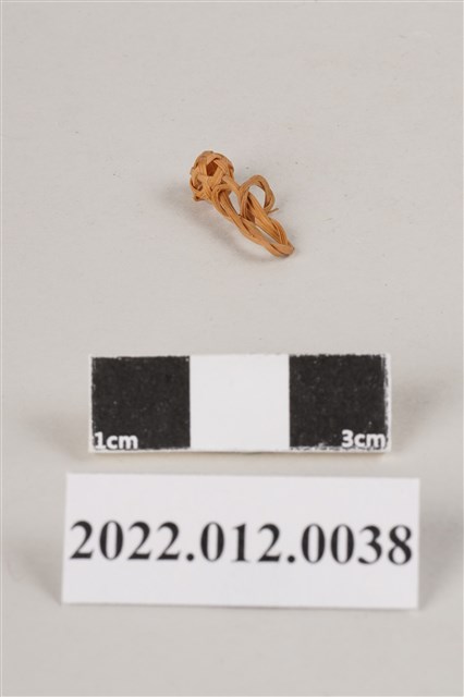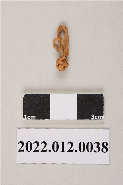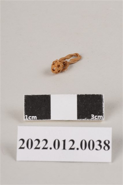 1. 本物件為劉靜枝編製籐編作品,為一顆五角編籐編圓球,其中一邊繫著一條藤條編織環,由兩條藤條交錯編織而成,編織環上又繫著一條較小的藤條編織環,物件形貌似吊飾。 2. 劉靜枝為民國31年次出生,關廟人,其竹編技藝傳承自其母親劉楊玉時,劉靜枝曾獲臺灣工藝研究中心邀請參加「中日工藝展」,她最為知名為竹編的小竹籃,由小到大的竹編籃,最小約0.7公分,精湛的技藝深獲好評。