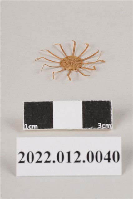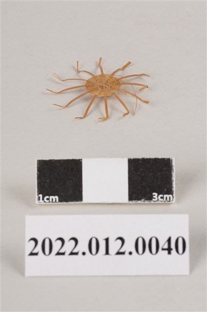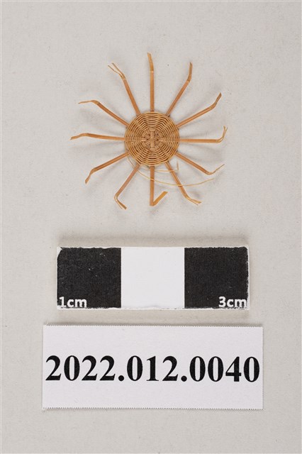 1. 本物件為劉靜枝所製作之圓形竹編半成品,以米字編編織,為挑一壓一的編製技法,未有轉折或裝飾性編織,未收邊的竹篾區塊尾端皆有摺痕,本件作品尚未完成。 2. 劉靜枝為民國31年次出生,關廟人,其竹編技藝傳承自其母親劉楊玉時,劉靜枝曾獲臺灣工藝研究中心邀請參加「中日工藝展」,她最為知名為竹編的小竹籃,由小到大的竹編籃,最小約0.7公分,精湛的技藝深獲好評。