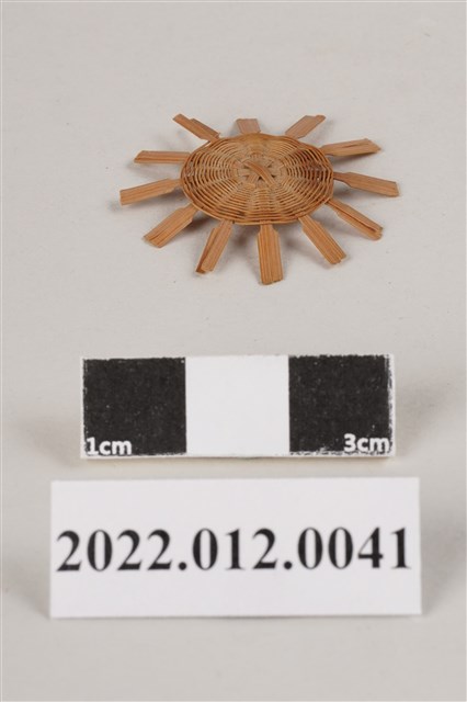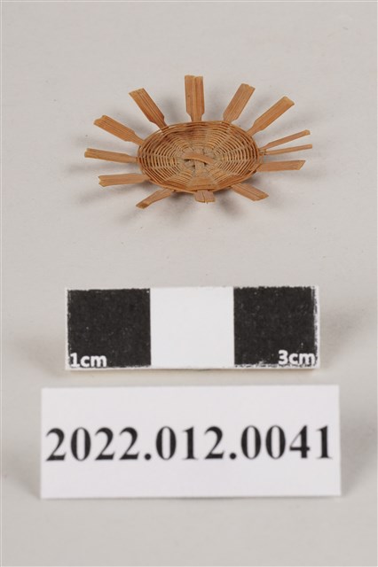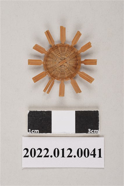 1. 本物件為劉靜枝所製作之圓形竹編半成品,以米字編編織,為挑一壓一的編製技法,未有轉折或裝飾性編織,未編織的竹篾區塊較寬大,似船槳形狀,本件作品尚未完成。 2. 劉靜枝為民國31年次出生,關廟人,其竹編技藝傳承自其母親劉楊玉時,劉靜枝曾獲臺灣工藝研究中心邀請參加「中日工藝展」,她最為知名為竹編的小竹籃,由小到大的竹編籃,最小約0.7公分,精湛的技藝深獲好評。