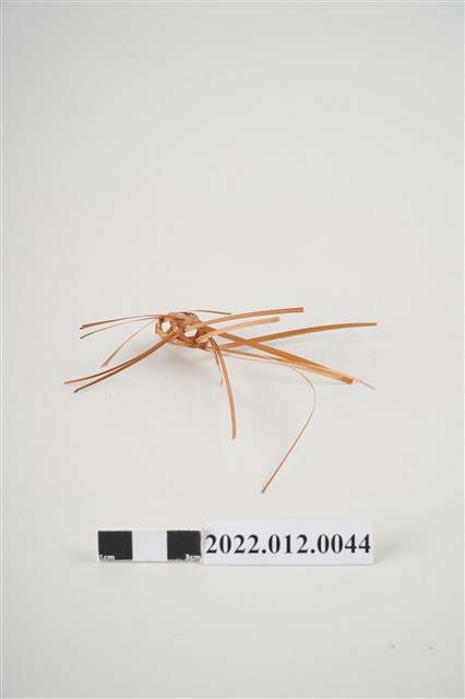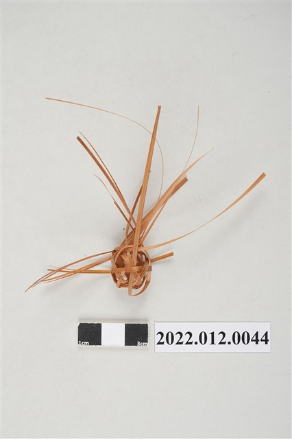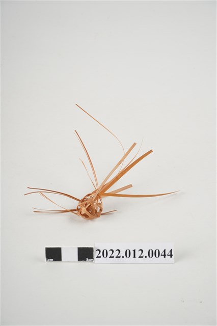 1. 本物件為劉靜枝所製作之圓球半成品,以五角編方式編製成零散的圓球體,數條竹篾已些微鬆脫,使五角形呈現不規則,竹篾未收邊,於球體各處向外延伸,此作品尚未完成。 2. 劉靜枝為民國31年次出生,關廟人,其竹編技藝傳承自其母親劉楊玉時,劉靜枝曾獲臺灣工藝研究中心邀請參加「中日工藝展」,她最為知名為竹編的小竹籃,由小到大的竹編籃,最小約0.7公分,精湛的技藝深獲好評。