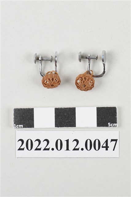 1. 本物件為劉靜枝編製竹編耳環,為一對夾式耳環,以輪口編起底編製,中間以挑四壓二的方式編織,形成空心的竹編圓球,以竹篾將竹編圓球與耳夾連接在一起。 2. 劉靜枝為民國31年次出生,關廟人,其竹編技藝傳承自其母親劉楊玉時,劉靜枝曾獲臺灣工藝研究中心邀請參加「中日工藝展」,她最為知名為竹編的小竹籃,由小到大的竹編籃,最小約0.7公分,精湛的技藝深獲好評。
