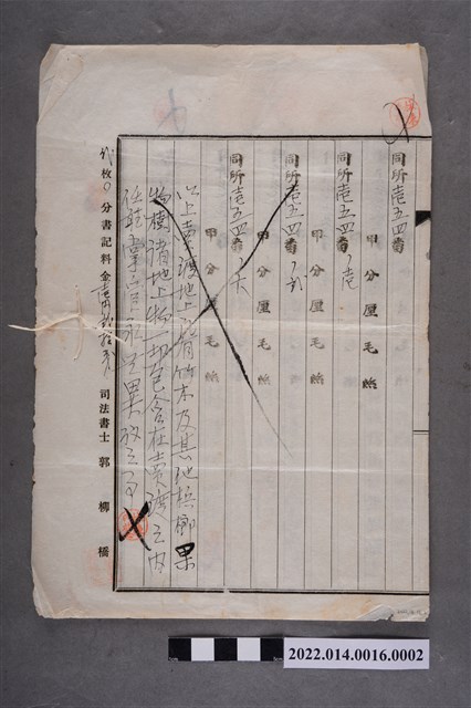 昭和14年(1939)9月2日林坤佐由其母林陳氏葱代表,與其二哥之子林建裕之土地買賣契約,委託司法書士(代書)郭柳橋代辦,交易土地位於嘉義郡中埔庄石硦,惟契約上林陳氏葱用印等多處打叉號,應為作廢。本件與前一件委任狀,同屬買賣相同土地之文書。