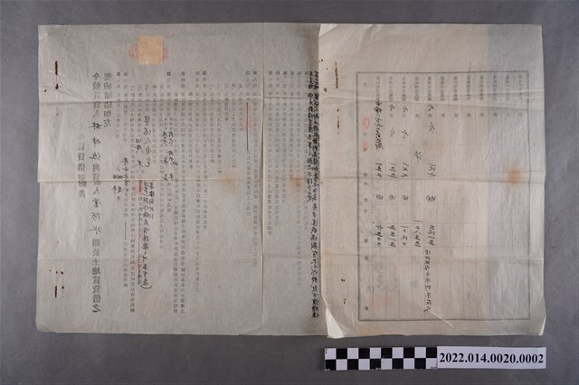 1.昭和11年7月18日林坤佐與曾阿水立土地賃貸借契約書,佃農曾阿水租用業主林坤佐位於臺南州嘉義郡中埔庄下六字司公廍的土地4筆,期限自昭和11年1月1日至昭和16年12月末日,附有土地清單。 2.賃貸人:林坤佐,賃借人:曾阿水,立會人:嘉義郡中埔庄農業組合長陳茂如。 3.林坤佐(1932-1988),為日本時代嘉義廳中埔區區長林乾之四子,戰後曾任嘉南農田水利會技工,擔任巡水員工作。