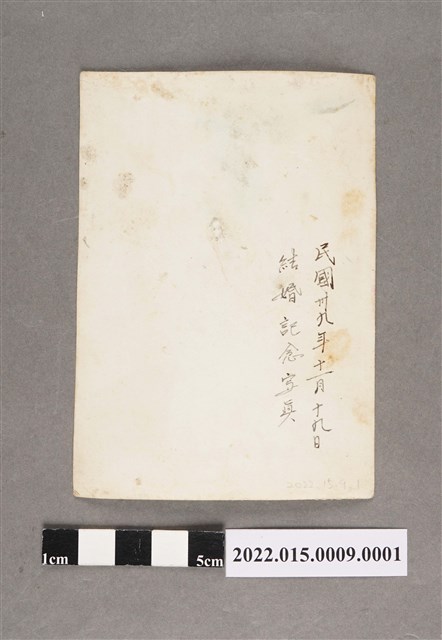 本張照片為鄭萍結婚時的新娘照,為結婚紀念寫真組的一部分。鄭萍結婚時的紀念寫真組,共計有6張,包括3張夫妻合照、2張迎娶照片、1張全家合照。 民國39年(1950)11月19日,鄭萍嫁至嘉義市西門街許家,婚後於民國40年(1951)請調至嘉義市民族國民學校服務,並與丈夫育有1子。