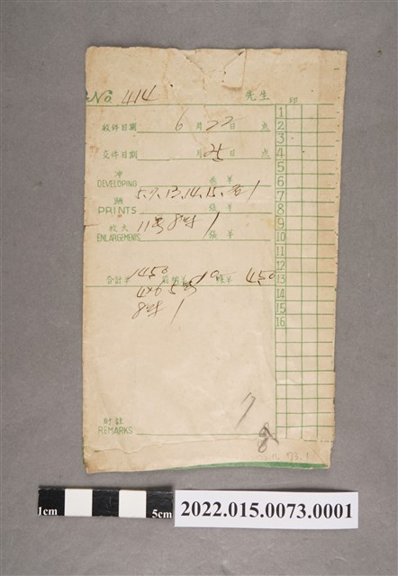 青葉照相材料行相片沖印紙袋,白底綠色單色印刷。「青葉照相材料行」位於嘉義市中山路402號,今日已成為餐廳使用。紙袋背面並未註記年代,但有寫明收件日期為6月22日,交件日期為6月25日;沖洗5張照片與放大1張照片,合計14.5元。