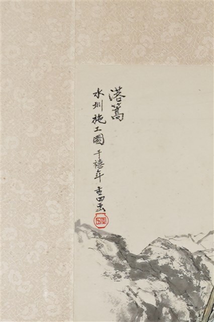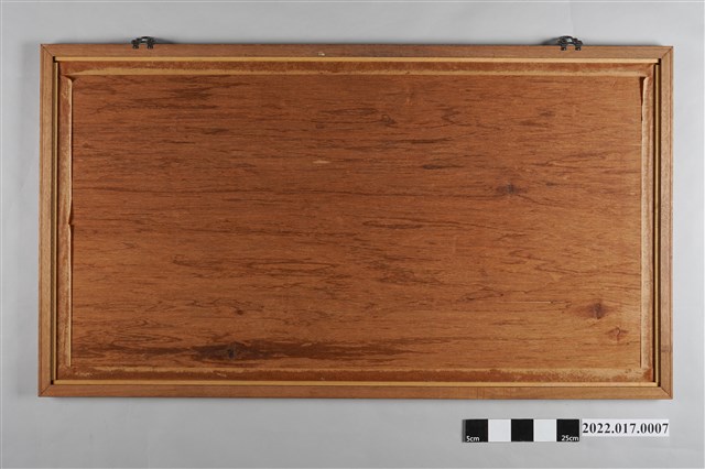 為黃金田繪《攔水:落篙》,為方形,外層有木質裱框,畫面中可見共有12名男子,光著身子於水流中進行引水工作,以石塊堆砌於三角錐竹架上,將其固定於水中,左上有「落篙」、「水圳施工圖千禧年□四□」黑色字樣與紅色蓋印,右上有白色說明卡,標題為「攔水」,內容為介紹圖畫中男子們正在進行的水利工程為何,以及如何進行。黃金田,生於昭和3年(1928)的南投水里,為陶藝家、歌仔戲佈景繪師、民俗畫繪者等,擅長以繪畫方式記錄鄉村市井小民的生活點滴。