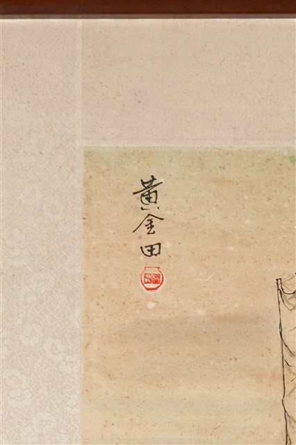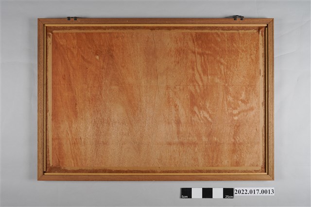 為黃金田繪《收稻》,為方形,外層有木質裱框,畫面中場景為稻穀成熟時採收場景,共可見9人,其中3人在收割,另有4人將收割完成之稻草把拿至集中處將稻穗拍打出來,左上有「黃金田」黑色字樣與紅色蓋印。黃金田,生於昭和3年(1928)的南投水里,為陶藝家、歌仔戲佈景繪師、民俗畫繪者等,擅長以繪畫方式記錄鄉村市井小民的生活點滴。