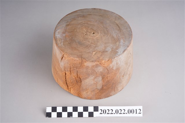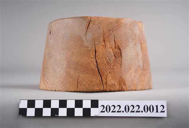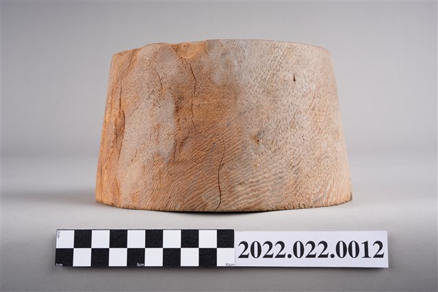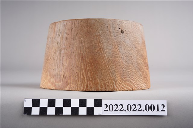 本件為編製草帽帽身的木模,外形呈圓柱狀,平頂,方角轉。編織者先編至帽子的頂部,以經緯各6-18條不等的原料,由帽頂中心編起,不斷加草編製成一個帽頂。編完頂部後,套於帽模上,繼續編製帽身至帽圍,借以控制帽身頭圍大小與形狀。