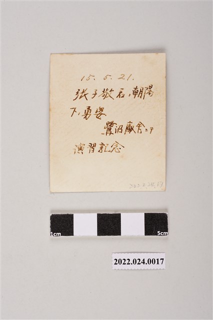 1.本物件為〈張子敬君朝陽下勇姿鷺沼廠舍演習紀念〉黑白照片,照片正面為頭戴學生帽身著學生裝手持長槍之男子站立於鷺沼廠舍前;背面由上至下書有「15.5.21」、「張子敬君朝陽下勇姿」、「鷺沼廠舍」、「演習紀念」等字樣。由照片推測照片拍攝時期為張子敬就讀齒科專門學校時期約莫20多歲。2.張子敬出生於大正5年(1916),臺中神岡人,國小畢業後赴日本讀書,中學後進入東京是麴町區私立日本齒科醫學專門學校就讀,昭和17年(1942)畢業隔年返臺,於梧棲臺中港附近開業,因港口沒落遷居高雄,於三民區建國路441號開設「增全齒科診所」。昭和21年(1946)取得臺灣省牙醫臨時證書,民國37年(1948)通過國家考試取得中華民國醫師考試及格證書,民國40年(1951)取得牙醫證書後入伍擔任軍醫,民國44年(1955)取得國防部臨時地方醫事人員講習證,並退伍擔任國防部預備幹部,民國69年(1980)加入高雄市牙醫師公會會員,民國72年(1983)獲頒行政院衛生署牙醫工作40年成績優良獎狀。於民國79年(1990)過世。
