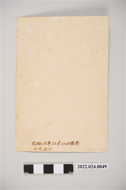 1.本物件為1941年12月10日張子敬與人合照黑白照片,照片正面為3名男子,前排2名男子身著3件式西服呈坐姿,後排男子身穿制服呈站姿;背面黏有殘膠且些微泛黃並於底下書有黑字「昭和16年12月10日攝影 大川 永田」。由照片得知拍攝時期張子敬為25歲。2.張子敬出生於大正5年(1916),臺中神岡人,國小畢業後赴日本讀書,中學後進入東京市麴町區私立日本齒科醫學專門學校就讀,昭和17年(1942)畢業隔年返臺,於梧棲臺中港附近開業,因港口沒落遷居高雄,於三民區建國路441號開設「增全齒科診所」。昭和21年(1946)取得臺灣省牙醫臨時證書,民國37年(1948)通過國家考試取得中華民國醫師考試及格證書,民國40年(1951)取得牙醫證書後入伍擔任軍醫,民國44年(1955)取得國防部臨時地方醫事人員講習證,並退伍擔任國防部預備幹部,民國69年(1980)加入高雄市牙醫師公會會員,民國72年(1983)獲頒行政院衛生署牙醫工作40年成績優良獎狀。於民國79年(1990)過世。