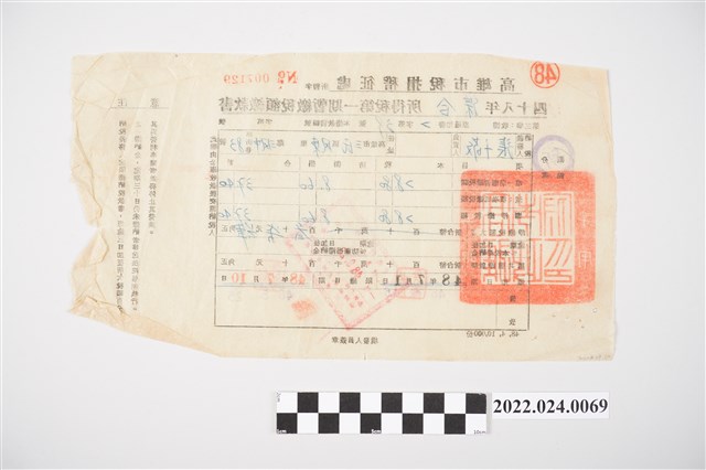 1.本物件為張子敬高雄市稅捐稽征處48年綜合所得稅第1期暫繳稅額繳款書,為第3聯收據,由上至下印且書有「高雄市稅捐稽徵處所暫字NO.007129」、「48年綜合所得稅第一期暫繳稅額繳款書」、「納稅義務人張子敬、地址、第1期暫繳稅額、應淨繳稅額、通知日期、限繳日期」等,且蓋紅印「高雄市政府」,右方則印有注意事項。2.戰後臺灣稅收制度沿襲日治以戶稅為主的舊制,後陸續實行國民政府於大陸時期所定稅制,為解決臺灣新舊稅制繁瑣,行政長官公署於民國35年(1946)將所得稅修正為42條條文,並改採5大類:第1類營利事業所得、第2類薪給報酬所得、第3類證券存款所得、第4類財產租賃所得、第5類一時所得,另外若當年所得總額超過60萬元者,並加徵綜合所得稅。民國38年(1949)政府遷臺後,物價上漲,臺幣供不應求,政府實施幣制改革,為因應幣制改革,民國38年(1949)9月7日所得稅之起徵額及稅率也配合修改,並規定所得稅之起徵額及課稅級距,得由財政部視經濟情形及國庫需要予以隨時擬定,呈請行政院核定施行。