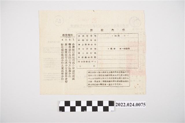 1.本物件為張子敬臺灣省高雄市稅捐稽征處所得稅查定通知書,為第3聯收據,正面由上至下印且書有「臺灣省高雄市稅捐稽徵處所得稅查詢通知書」、「納稅扣繳公司行號增全齒科、負責人姓名張子敬、地址三鳳中街、所得時期、應納所得稅額、總計、通知日期、限繳日期」等,且蓋紅印「臺灣銀行高雄分行代理高雄市公庫」,右方則印有滯纳處分提要;背面則印有繳稅內容、繳款提要等。2.戰後臺灣稅收制度沿襲日治以戶稅為主的舊制,後陸續實行國民政府於大陸時期所定稅制,為解決臺灣新舊稅制繁瑣,行政長官公署於民國35年(1946)將所得稅修正為42條條文,並改採5大類:第1類營利事業所得、第2類薪給報酬所得、第3類證券存款所得、第4類財產租賃所得、第5類一時所得,另外若當年所得總額超過60萬元者,並加徵綜合所得稅。民國38年(1949)政府遷臺後,物價上漲,臺幣供不應求,政府實施幣制改革,為因應幣制改革,民國38年(1949)9月7日所得稅之起徵額及稅率也配合修改,並規定所得稅之起徵額及課稅級距,得由財政部視經濟情形及國庫需要予以隨時擬定,呈請行政院核定施行。