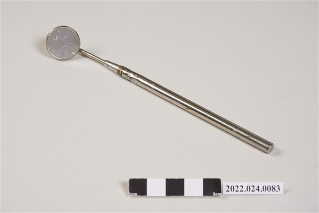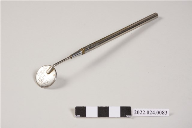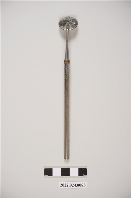 1. 牙科用不鏽鋼內窺鏡,又稱口鏡。不銹鋼細長柄,一頭彎曲內側附有一個小圓鏡。通常用於口腔檢查時,觀察牙面情況和口內結構,是牙醫師視野延伸不可或缺的工具。2. 本件為捐贈者父親張子敬醫師牙醫治療工具箱內之器械。