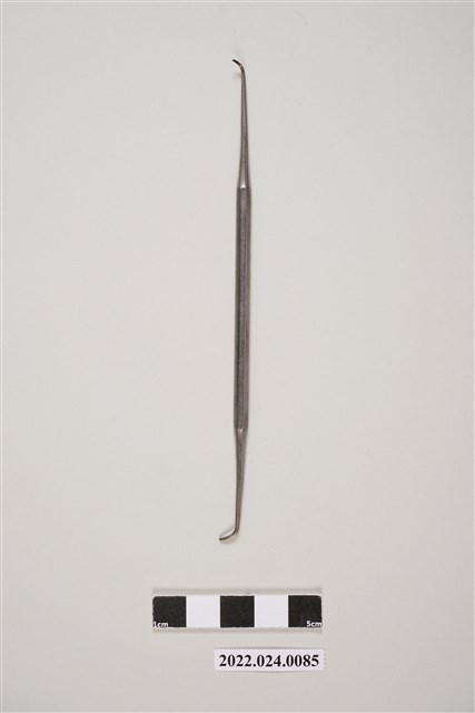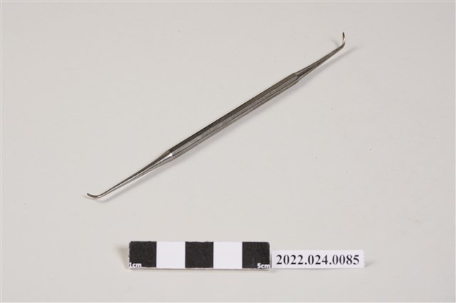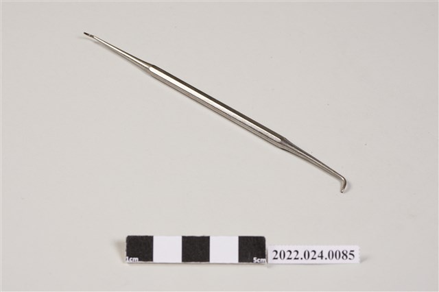 1. 牙科用雙頭不銹鋼彎弧形探針,探針尖端略呈彎弧狀。主要為牙醫口腔檢查或治療時,用以探索牙齒表面溝壑、齲洞和過敏區,檢視窩洞深淺和大小。2. 本件為捐贈者父親張子敬醫師牙醫治療工具箱內之器械。