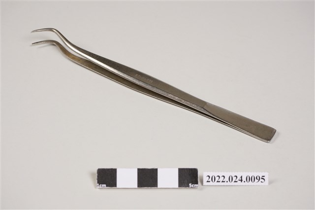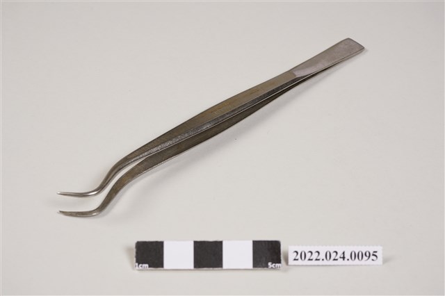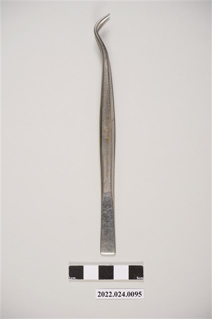 1. 牙科用不鏽鋼彎角鑷子,主要用於口腔檢查時夾取敷料、異物、藥物或試搖齒冠。握柄處中段有「STAINLESS」字樣。2. 本件為捐贈者父親張子敬醫師牙醫治療工具箱內之器械。