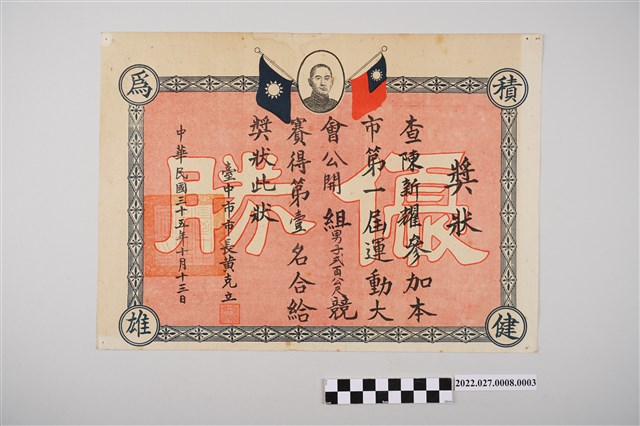陳新耀參與民國三十五年臺中市第一屆運動大會公開組男子貳百公尺競賽第一名獎狀