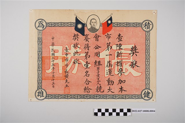 陳新耀參與民國三十五年臺中市第一屆運動大會公開組男子壹百公尺競賽第一名獎狀