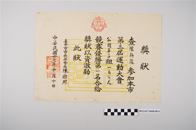 2022.027.0008.0011 陳新耀參加民國三十七年臺中市第三屆運動大會一百公尺優勝獎狀