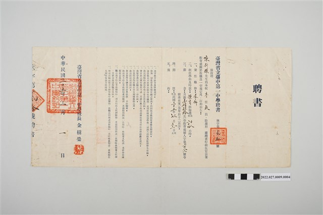 2022.027.0009.0004 陳新耀台灣省立台中第一中學聘書