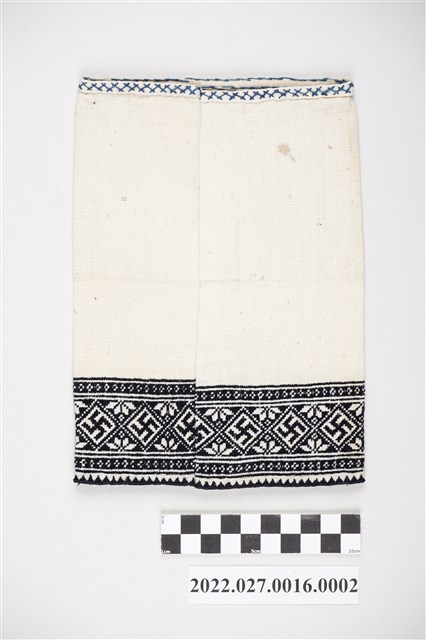 臺灣原住民的衣服,主要運用刺繡、貼布、滾邊、綴珠等方式裝飾。本件以白色布料為底,繡有幾何花葉紋和卐字紋。繡紋與組合方式具南部平埔族群刺繡圖紋特徵。