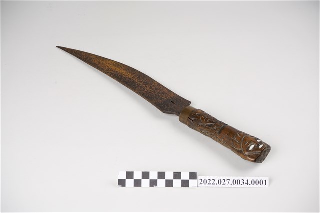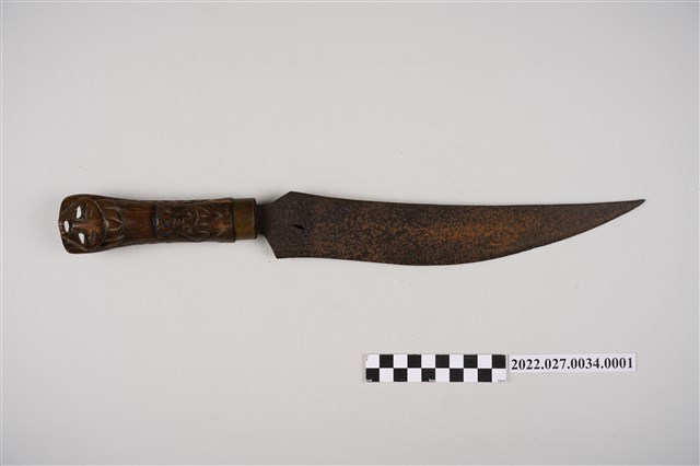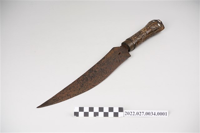 本件刀身為鐵製,單刃,刀尖略向刀背處上翹。刀柄為圓柱狀,上有人頭雕刻,鑲有螺貝。