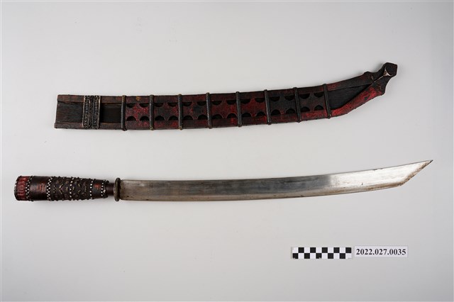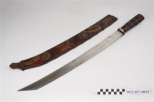 本件佩刀,刀身為鐵製,單刃,刀尖略向刀背處上翹。刀柄為圓柱狀,上鑲有金屬片。 刀鞘為單面木製,另一面嵌上金屬片、有連續半圓鏤空。 刀鞘上刻有百步蛇紋和蝴蝶紋,刀尖處雕刻蛇首。