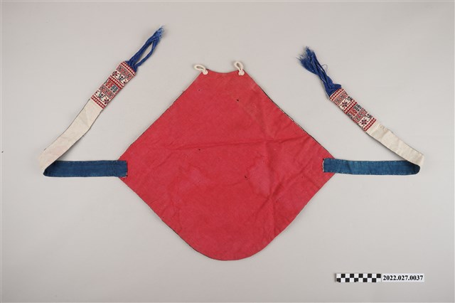 本件肚兜中心部為紅色布、其餘以白色底布紅藍繡線構成圖紋。圖案包含幾何花葉紋、鳥紋、人紋、花籃紋、動物紋、連續線條紋等組合,綁帶上則有連續「囍」字。與館藏漢人製肚兜相比,兩者圖紋的內容組成相似,但本件較為簡化。從繡紋圖樣推測,應為南部平原地區西拉雅人製作、使用之物。