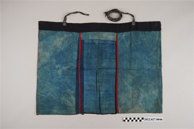 本件與西拉雅族刺繡布作為同一組物件入藏。從物件大小和長度來看,可能為腰圍或桌裙。主要以三塊繡布、兩條刺繡布條拼貼於黑布上,並在無貼布處施以刺繡圖紋。整件以深藍色布疋作為襯底、依圖紋分布可分為三區塊。中間區塊為整塊矩形繡片,由菱形與草葉紋組成。左右兩邊圖紋對稱,上半為米字型圖案、下半為矩形繡片圖紋由菱形組成。從整體的布塊組成方式和刺繡圖紋與用色來看,並非已知西拉雅族之特徵,推測應是與外部社會交易取得之物。