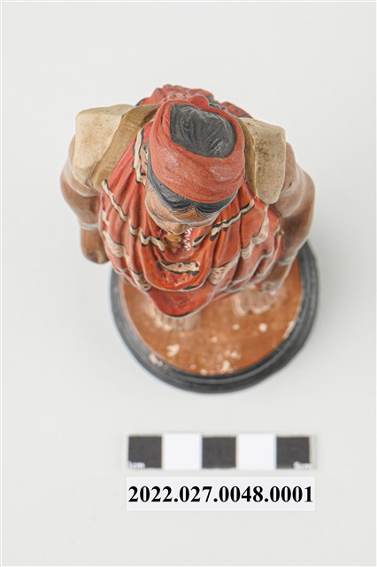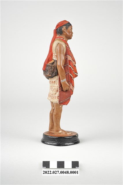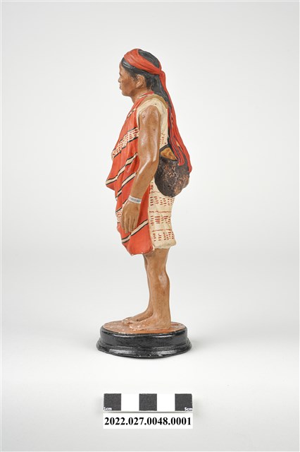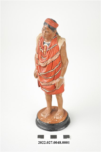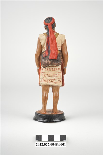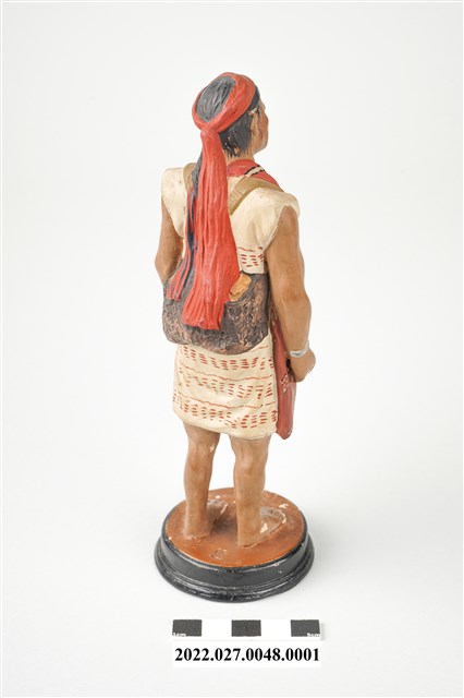此件人偶為泰雅族男性人像,細緻呈現表徵其文化的衣著與裝飾。