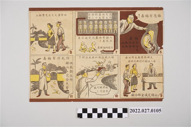 1. 本物件為梅毒教育宣傳廣告。為安全署農復會新聞處與臺灣省衛生處性病防治中心編印。標題為「治癒性病使家族健康」以漫畫方式宣導有相關症狀者可至衛生所免費驗血檢測。