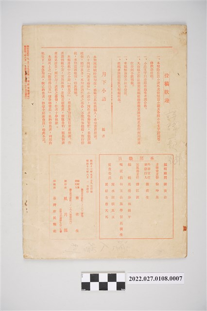 1.《風月報》為日治時期通俗文藝雜誌,刊登藝伎小傳、笑話、謎語、民俗歌謠、奇譚、章回小說、白話小說等內容,兼容新舊文體。其前身為1935年至1936年發行之《風月》,《風月報》1937年7月於臺北出版,期數自第45期起算,至1941年6月發行第132期後停刊。