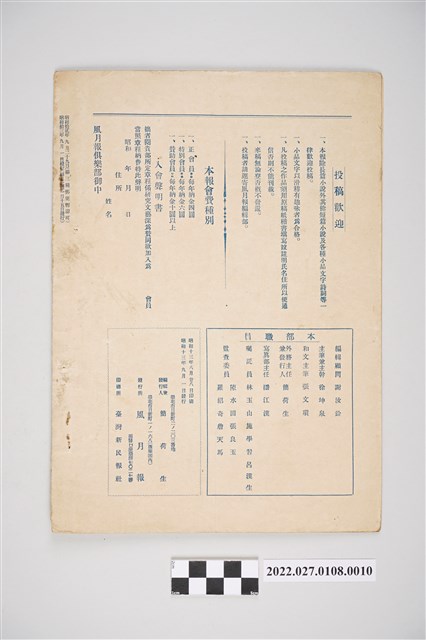1.《風月報》為日治時期通俗文藝雜誌,刊登藝伎小傳、笑話、謎語、民俗歌謠、奇譚、章回小說、白話小說等內容,兼容新舊文體。其前身為1935年至1936年發行之《風月》,《風月報》1937年7月於臺北出版,期數自第45期起算,至1941年6月發行第132期後停刊。