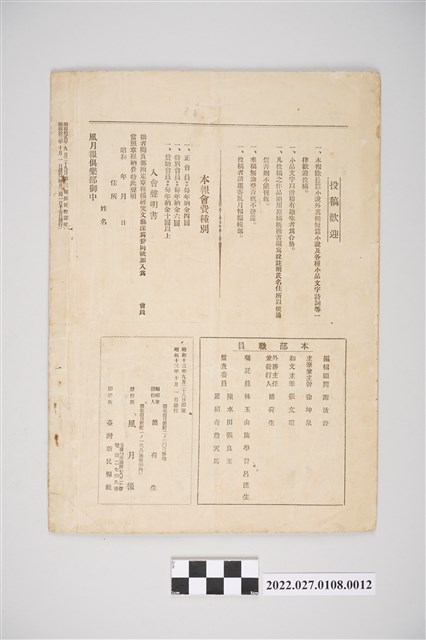 1.《風月報》為日治時期通俗文藝雜誌,刊登藝伎小傳、笑話、謎語、民俗歌謠、奇譚、章回小說、白話小說等內容,兼容新舊文體。其前身為1935年至1936年發行之《風月》,《風月報》1937年7月於臺北出版,期數自第45期起算,至1941年6月發行第132期後停刊。