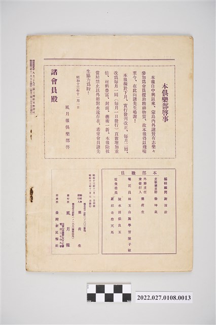 2.《風月報》第75期(11月號上卷)於昭和13年(西元1938年)11月5日發行。