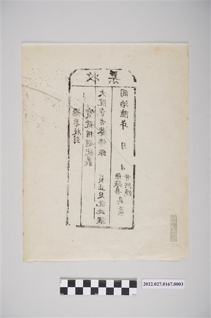 同治陸年木製版印組,內容憑票收到寶號捐題仗義,含拓印工具與拓印紙紙2張。類似收據的功能亦屬清領時代臺灣社會救恤扶危的公益活動的歷史見證。