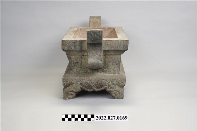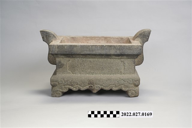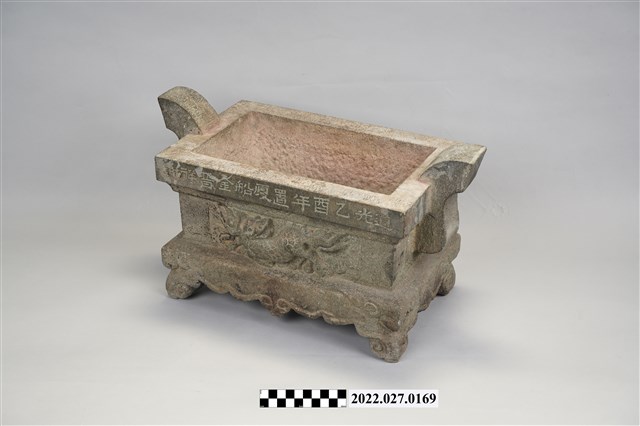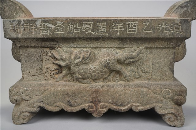 正面束頸處陰刻有「道光乙酉年置廈船金晋祥謝」,爐身中央高浮雕麒麟造型,石雕香爐的作用,是盛載香支,以作寺廟日常供奉神明之用。