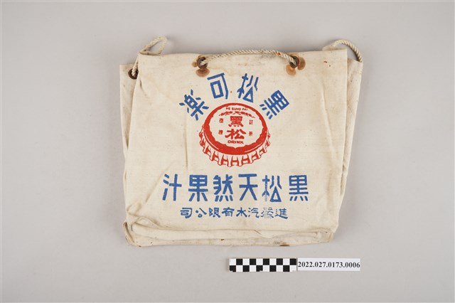 進馨汽水有限公司黑松天然果可樂廣告宣傳帆布袋,底色為白色,有麻繩作為提帶,帆布袋的中央印有商品或註冊商標的廣告宣傳圖樣。