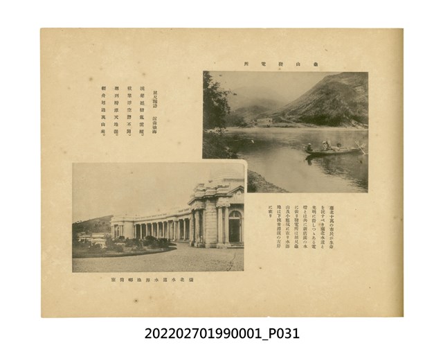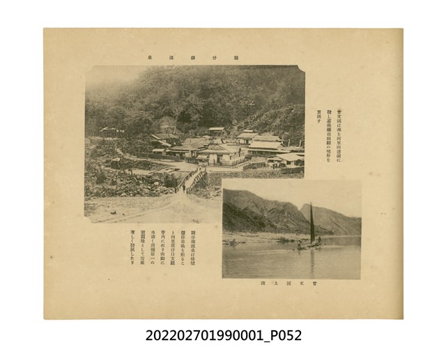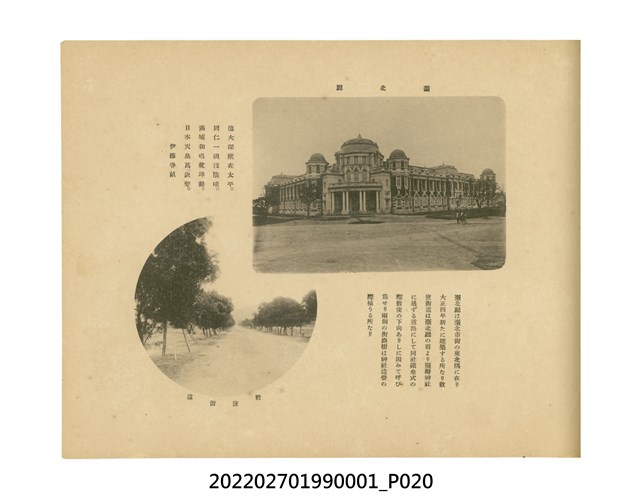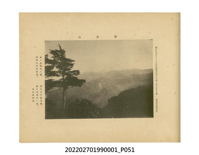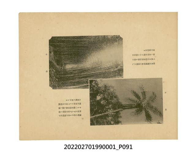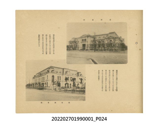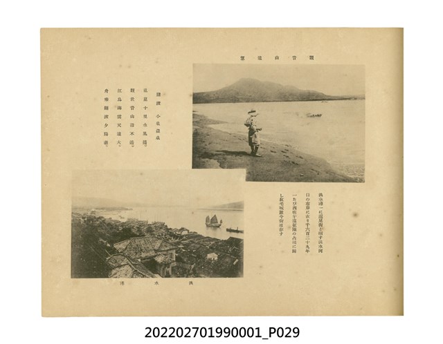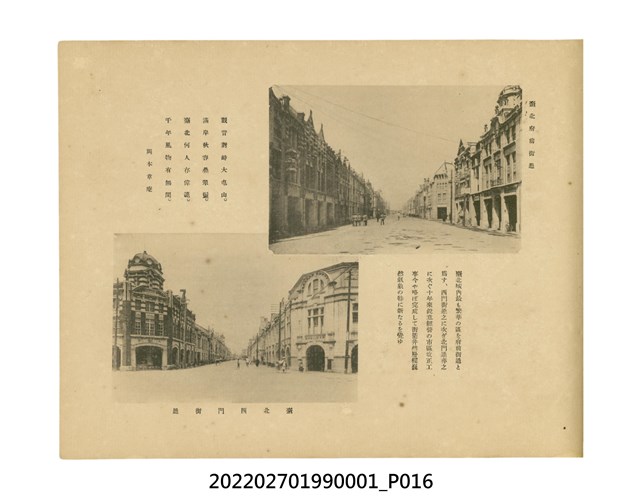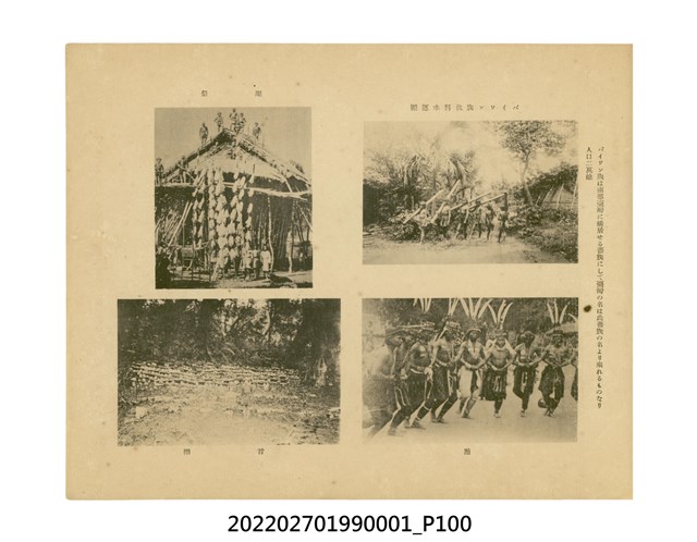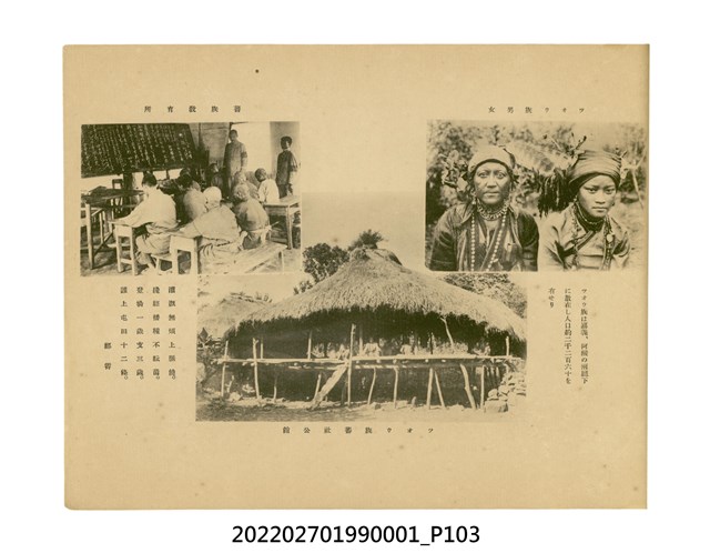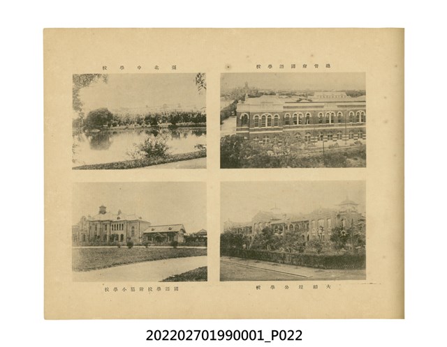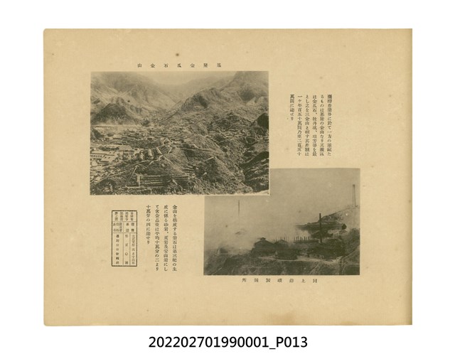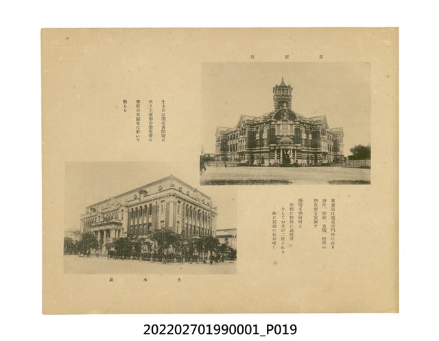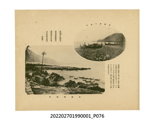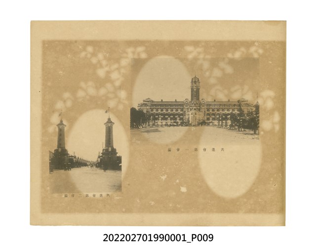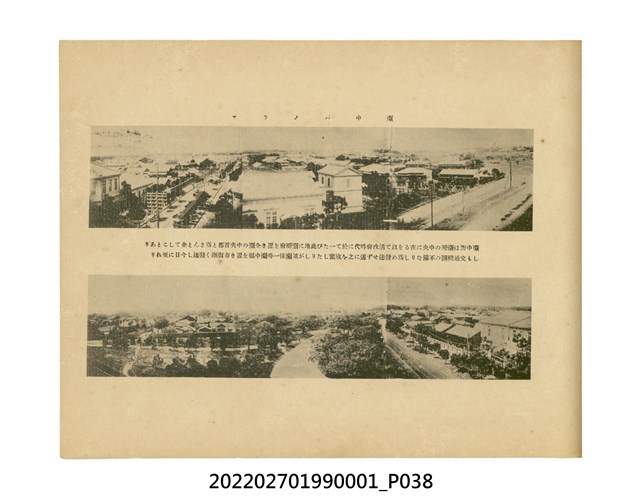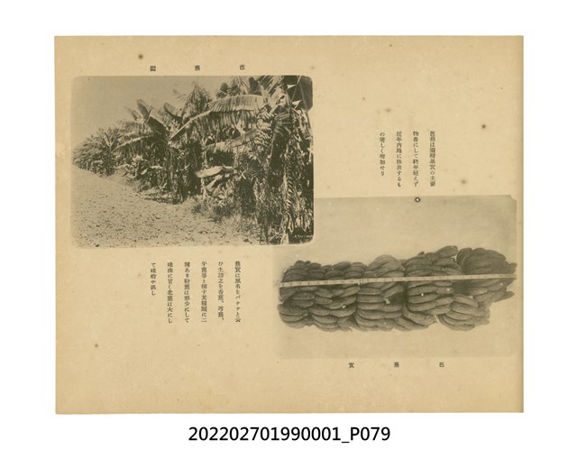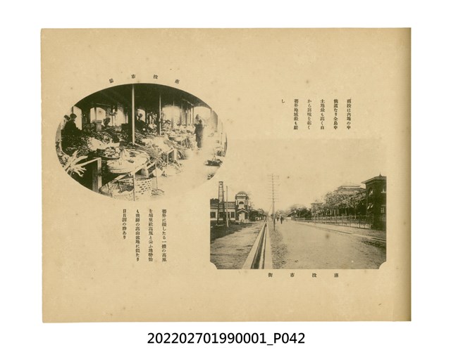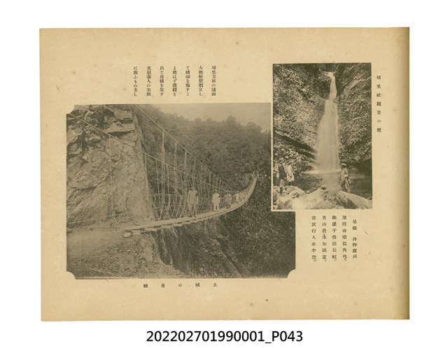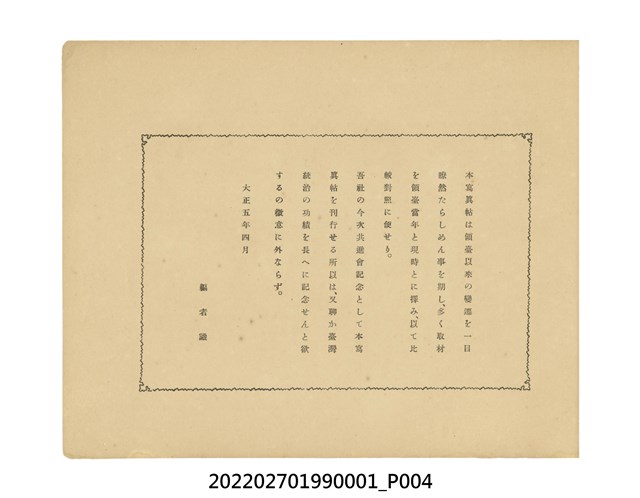 本件是臺灣總督府民政部發行的《記念臺灣寫真帖》,共兩本。皆採橫式印刷,線裝,一本以米色為底,上以草體書寫書名;一本以灰色花紋圖案為底。內頁封面有手寫之「記念臺灣寫真帖」字樣。照片之前,有總督安東貞美的題字,以及民政長官內田嘉吉的文章。收錄上百張照片,按地理位置由北部而南部、由西部到東部編排,主題包括臺灣風景、街道、建設、產業及原住民族等。每張照片附有題名,部分有解說。最末是版權頁,上載印刷、發行資訊。