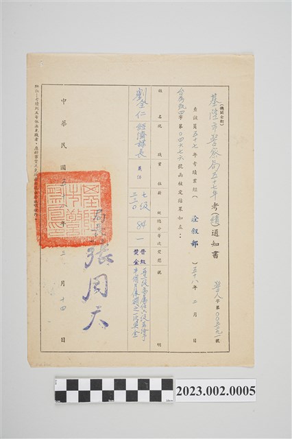 2023.002.0005 民國58年3月14日劉全仁基隆市警察局五十七年考(績)通知書