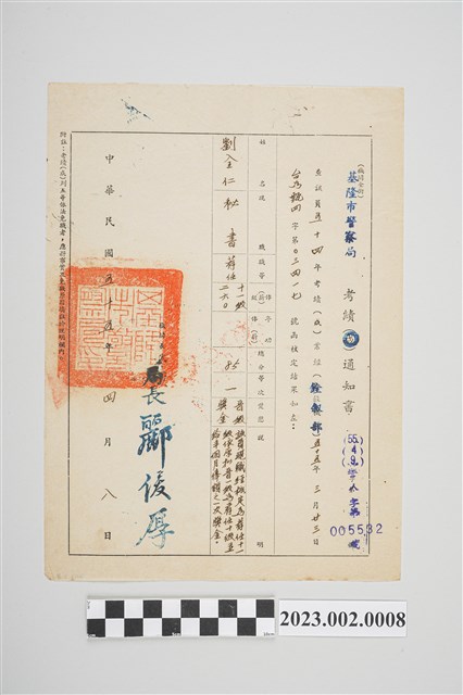 2023.002.0008 民國55年4月8日劉全仁基隆市警察局考績通知書